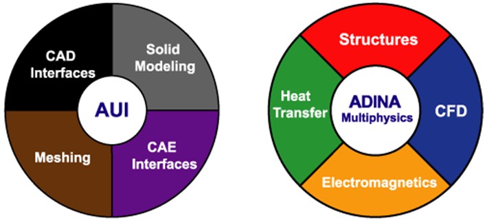 ADINA Multiphysics 包含所有模块、具有更强大的功能 | ADINA Multiphysics全模块包含了ADINA中所有的求解器,不仅可求解结构力学、传热、流体力学问题,还能够实现多场耦合分析,如流固耦合、热固耦合、多孔介质流动、压电、焦耳热,甚至更多物理场的交互分析。 |